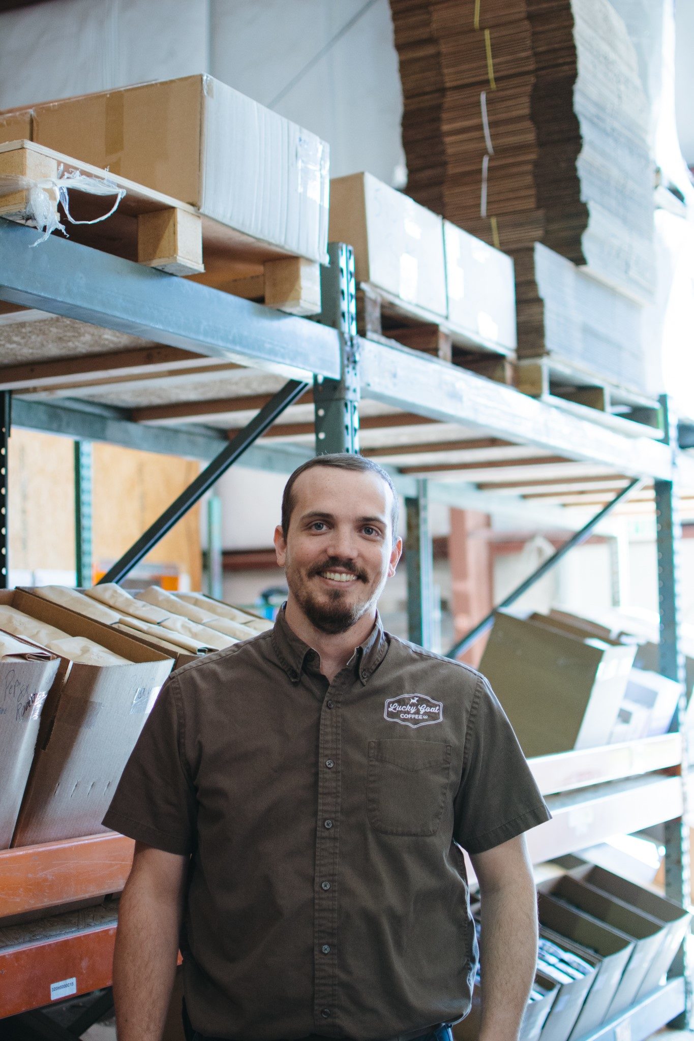 On an early Thursday morning, I drove out to what seemed the middle of nowhere to conduct an interview with our Wholesale Manager, Caleb, in what can only be described as his castle. A 10,000 sq. ft. warehouse decorated with coffee brewing equipment, supplies, syrups, machinery, and even Lucky Goat’s famous Brew Bus tucked away in one of the corners. Caleb walked in with a messenger bag over one shoulder and a cup of coffee in the other hand. “Morning!” he yelled as he walked toward his office. I followed, and we began to chat.